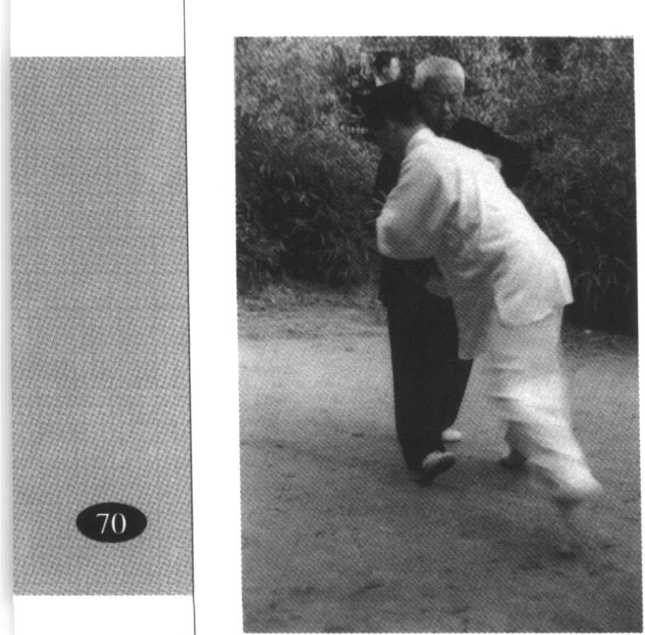 动作一,接劲:在推手 中,白方两手向黑方推来,黑 方要精神集中,意念要放在 与对方的接劲点上,要有腾 挪之势(图68)。图69图69图69图69动作二,顺粘:黑方用 右臂承接,不躲不闪,接定 彼劲,顺随对方之劲,腰向 右微转,利用两臂的阴阳调 整,使白方两足离地,拔根, 身体失控(如继续向右转 腰,粘带白方即可向前栽 跌)(图69)o动作三,拥发:如果黑 方此时松沉,涵蓄,以立圈 进身,向前拥发,白方可向 后栽跌(图70)。图71图71图71图71