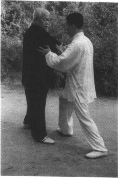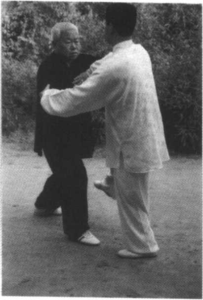 动作一,问接:在推手 中,黑方主动将身体前移,腰 向左转,利用右臂向白方身 体拥挤,迫使白方用力相抵 (图 71)。动作二,吸粘:在黑方之 劲与白方之来劲相等时,黑 方利用腰的旋转,虚实的调 整,向右转腰磨胯,同时利用 两手阴阳的调整,使白方落 空、拔根、失控(图72)。图73图73图73图73动作三,拥发:这时黑方 即可向右后方粘带,亦可利 用松沉之劲,向前上划弧拥 发,可使白方向后栽跌(图73)O