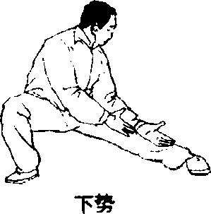 仆步的左腿平伸,脚掌内扣,右手由勾手向前交掌,附于 左腕横纹之后,随下仆势,左臂前伸,右臂弯曲,两手侧掌,左 手伸近左脚尖,右手抽回腹前,靠近左肘前臂内侧,两掌同时 下切。
