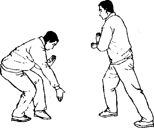 两臂先上下相交合,坐腿,然后弓腿分臂,左分则左手先 合于右下,右分则右手先合于左下,并且两手分拉,用抽丝劲。