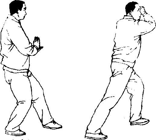为弓步,身型偏中寓正,两手腕内侧交叉,置于额外侧,近 太阳穴处。如为左披身,则是左弓步,左手在内,右手在外。如 为右披身则相反,是右弓步,右手在内,左手在外。眼看相反方 向。