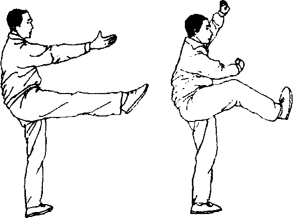 左脚着地稳定有力,为左独立势,右膝提高,超过胯的水 平。右脚尖上挑为“撩阴脚气臂成弧形,右拳收于腹前,左拳 上提于额上,两拳上下相对,拳眼相照。