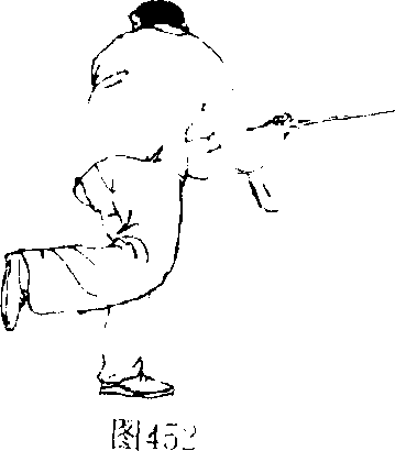 2 .跳步反腕:右刑蹬地起跳,同时凌空向'右转体,随着左 脚落地,右手同时转腕,使手心向内,剑尖向左后。(图452 )