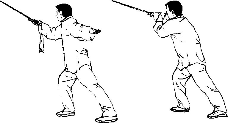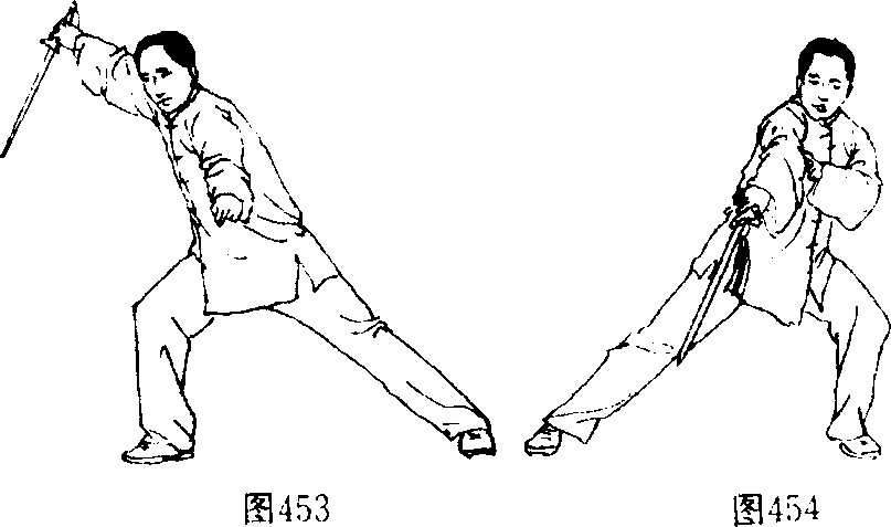 1. 回身扫剑:重心后移于右脚,同时向右后转腰至西南, 右手反腕,手心仰向前,左剑指按前臂内侧,剑尖斜向外下方, 向右后斜扫约180。左右。(图451)