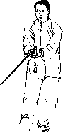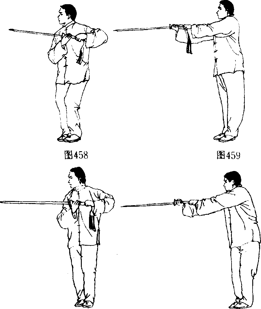 1. 收步回抽:左脚略向外撇约45。,右脚跟向左脚跟靠 拢,右手反手握剑,手心向上,立剑抽回胸前,高与肩平齐,双 手握把,剑尖向西。眼看剑尖。(图458)