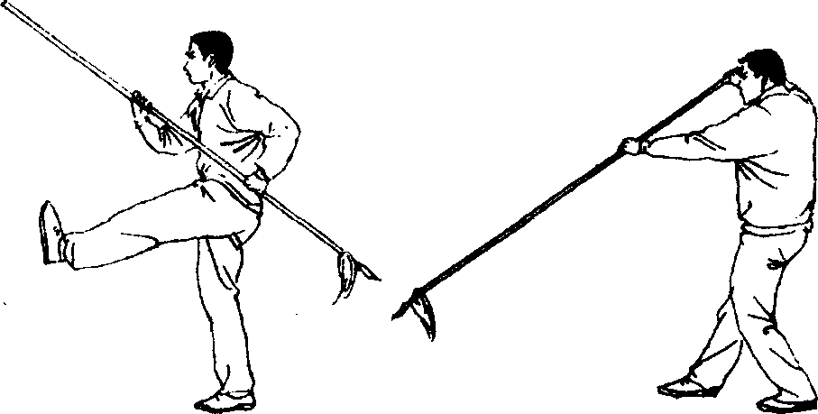 3. 落步钩挂:右脚向前落步,同时左手持杆使枪尖从上 向前右下方钩挂。