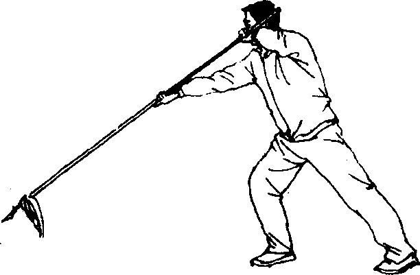 9. 弓步下刺:枪尖向左下划弧再向前下方扎刺,左手正 手握杆,右手在胸前反手握把前约30厘米处,同时重心前移 至左脚成左弓步。眼看前下方。