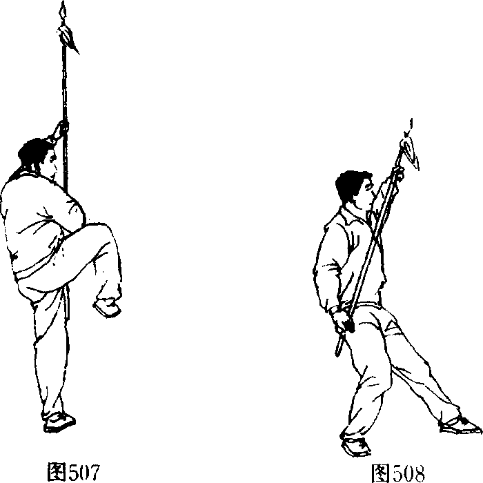 右斜下方拉伸,左臂外展,左手松握,虎口靠近枪尖。眼看正前 方(东)。(图508) -