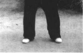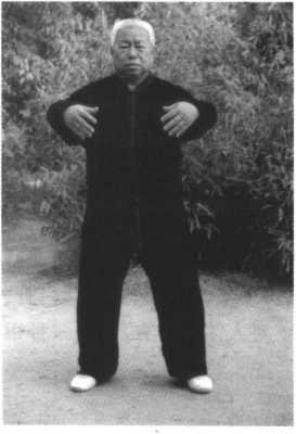 身体自然站立,两足分开 与肩同宽,两腿微屈,腰胯放 松,两眼向前平视,做到提顶、 吊裆、含胸、拔背、松肩、沉肘、 气沉丹田、尾闾正中之身法。 两手抬于两胯前,手心向下, 指尖朝前,两手有下按之意, 又有上提之感。要求做到平心 静气,呼吸自然,从每天早晚 站半小时做起,逐渐增至每次 站一小时左右,练到一定程 度,意气与呼吸即可相配,长 期坚持,即能达到内劲增长、
