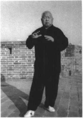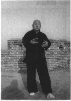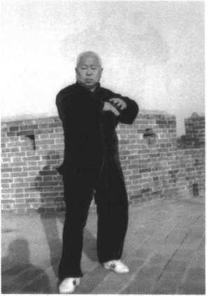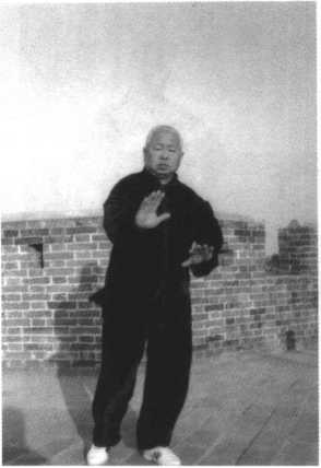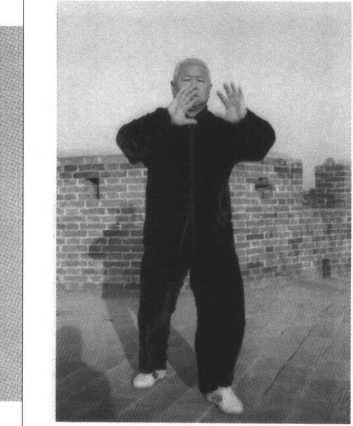 动作二:承前式,身体 向下松沉,右实腿精神贯 注,左腿抬起向前45。迈 步落实,微向前弓。同时,两 手弧形向上挪起,左手内旋 用肘从胸前向前微伸,右手 内旋至左手右后方,以吸气 配合,目视左肘前方。(图 42)