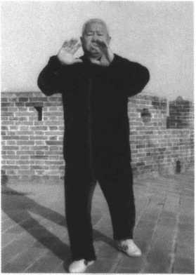 动作七:承前式,腰微向 右转,身体后移,重心坐于左 腿。同时,两手弧形内旋向左 下后方沉带,右手至胸右侧, 左手至胸前,以吸气配合,目 视两手前方。(图47) 动作八:承前式,左足跟 蹬地,右腿前弓。同时两手弧 形坐腕竖掌外旋从胸前推 出,以呼气配合,目视两手前 方。(图48) 要领:此式同样是在懒 扎武式的基础上,进行复合 劲的演变。要注意腰腿的左 右旋转与两手的密切配合, 当右手搠起向上向前进肘 时,肘起到向对方问劲的作 用,腰腿要同时前移,在与对 方之劲相合时,肘腰腿同时 向后下沉带,在沉带的同时做到松沉协调。同时要注意两手的开合滚旋,发力时要先松后
