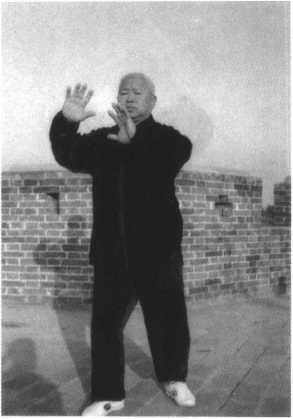 动作一:承前式,右实 腿精神贯注,身体向下松 沉,左腿向前45°迈步落 实前弓。同时两手弧形向 上搠起,从胸前坐腕竖掌 外旋,向前推出,以呼气配 合,目视两手前方。(图55)