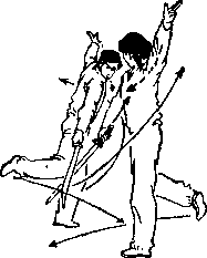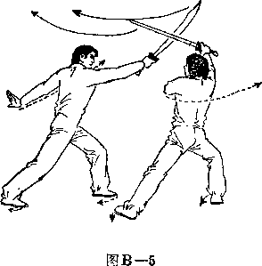 乙身体向右后闪躲右脚向右后退步右腿屈膝左腿