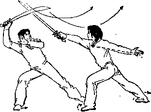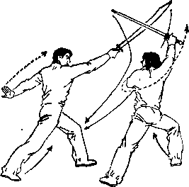 部剑尖朝左前上方左手剑指顺势向左后摆手心朝前略
