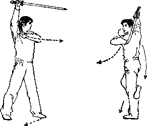 上举刀背沿左肩贴背绕至右肩后刀刃朝后刀尖朝下}左