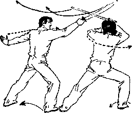 甲身体左转右脚船地向左移后限提起避躲乙剑,