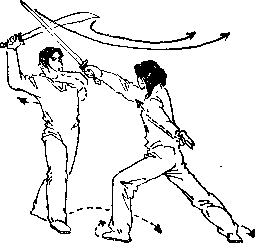 甲身体向右后闪躲乙剑右脚向右后撤半步两腿微屈右臂内旋上举右手握刀用刀身向右上架乙剑刀刃朝后