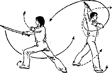 砍乙头部刀尖朝左前上方顶左掌向左后摆略低于肩目