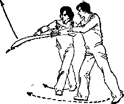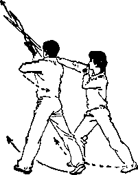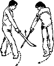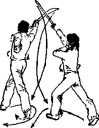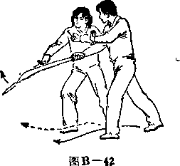 手握刀继续架住乙剑向右前上撩刀尖朝右前上方刀高于