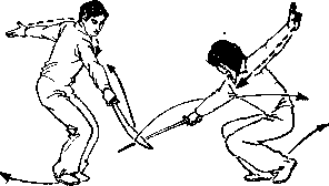 乙身体左转135°)上体稍后仰闪躲甲刀右脚向左前上步右腿屈膝左腿蹬直成右弓步右手握剑剑尖向