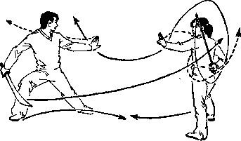 随即屈腕平剑使剑尖经胸腹间弧形向左腋下穿出剑尖朝