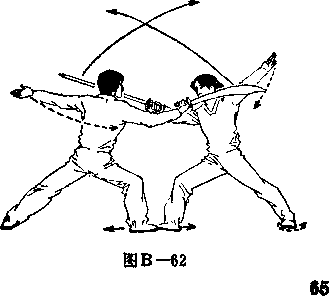 乙身体右转180°左脚向右上步屈膝右腿蹬直成左弓步右臂伸直上举右手握剑剑尖继续向前向右上划弧剑尖朝右上左臂伸直剑指向左后摆高与肩平3目视剑(图—59)