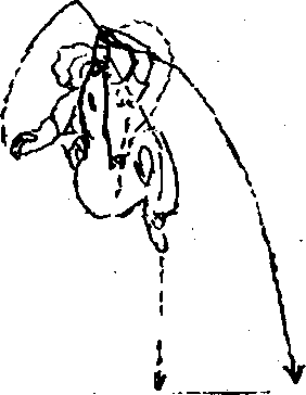 臂向下,向上随转体抡摆;右脚蹬地起跳。(国23③)