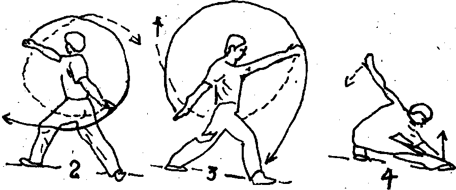 (3)重心右移,身体向左后拧转,左腰向左上方摆起;同时,两