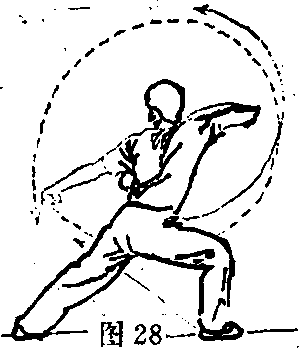 (2)身体左转成左弓步;同时,右掌向下,向前抡摆,在掌向下, 向后抡摆3目视右就(图27②)(3)身体右转成右弓步洞时,右掌 继续向上向右,向后抡摆,左掌向左、向上、向前抡目视左掌。