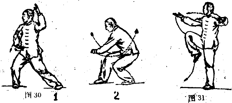 (2)重心移至左腿,右脚提起,脚尖转向前方,脚前掌落地,成 右金步’上体向下松沉,微向前俯佐掌自上而下横按于右膝前上 方为指类向右,右掌按于右胯旁,指尖百前,目视前下方(图30②)。