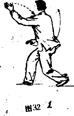 转下捋,左臂外旋,左掌向上,向右划弧,目视前方(图32①)。