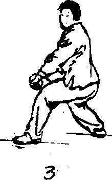 (3)右脚前掌为轴,脚跟外展,身体左转,右腿屈弓,左梆后撤 」殄「脚尖外展营地'两掌随转身向左平捋至体前,右掌高与头平,