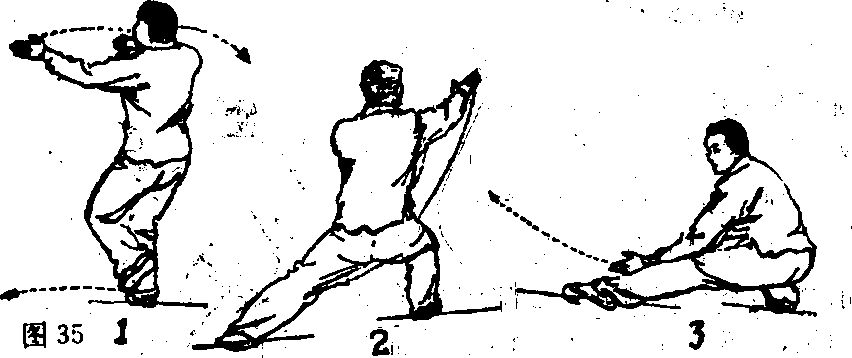 ⑶右腿全蹲,左腿铺直,上体左转,成左仆步洒.掌绕转,指尖 转向左,经腹前顺左腿内侧向左穿出,左掌在前,掌心向外,右掌在 后,掌心向内;目视左掌(图35③)。