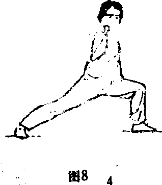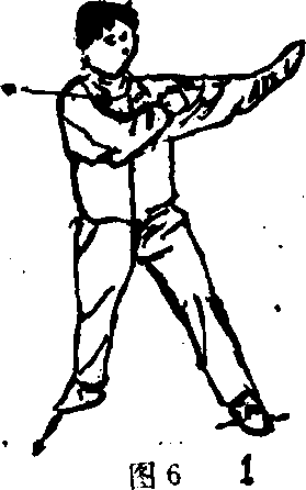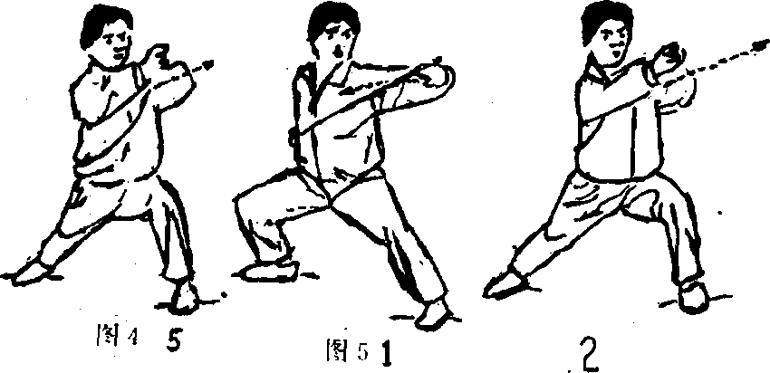 (1)页心后侧成必半马步,左掌经n臂上侧向前平抹,4 :拳收 『腰后侧。(图5①)