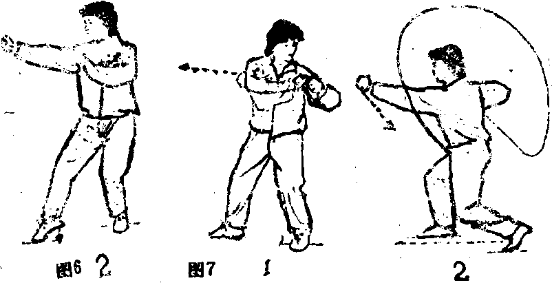 (2) 右脚向右前方上步,脚尖点地 成高虚步;右拳向右平抡鞭挞,左臂屈 肘,左掌护于右胸前,掌心朝右下方, 目视右前方。(图6②)