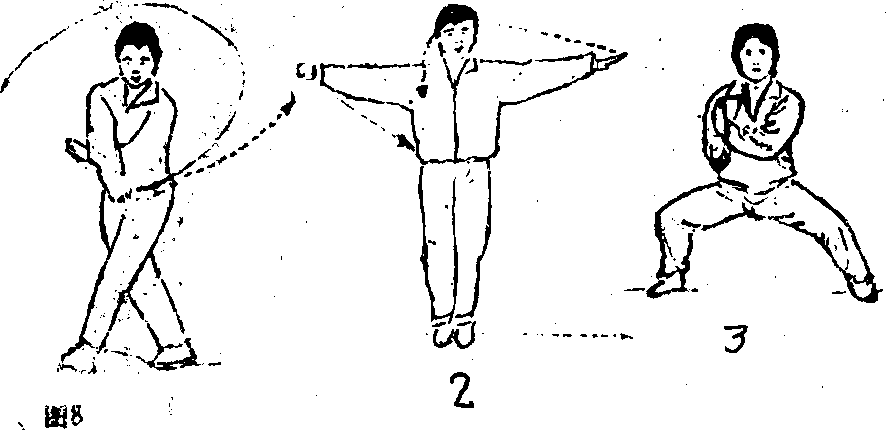 程)右脚向左掷并拢,两腿微屈,右拳经左向上两右划瓶抡, 左掌箸下"上渺渺"朝下,目视前方。(图8②)
