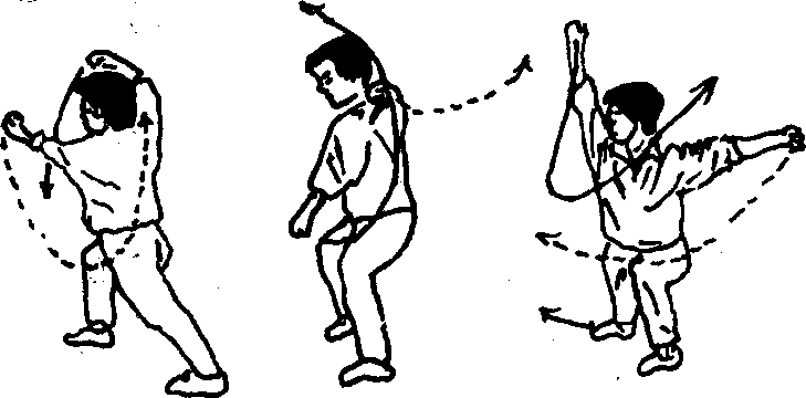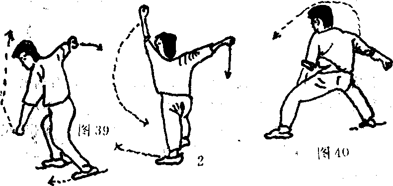 摆,耳裨左前方。(图39①②)摆,耳裨左前方。(图39①②),身体右转成横裆步;左拳经下向右上方抛起右拳下:落向右抡