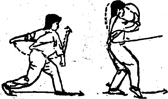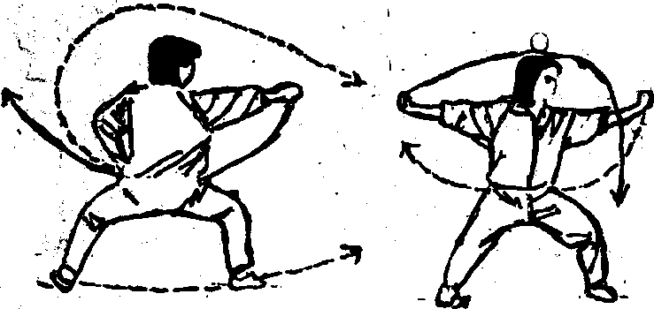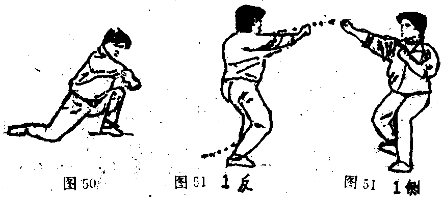 (1)起身右拳向前鞭挞,左掌变拳屈收于右胸前,目I?右拳。 (图51①及反面图)