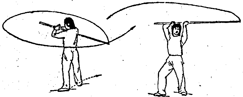 (3) 身体左后转,右脚向溯1?步;同时,棍随体转向左平绕,棍