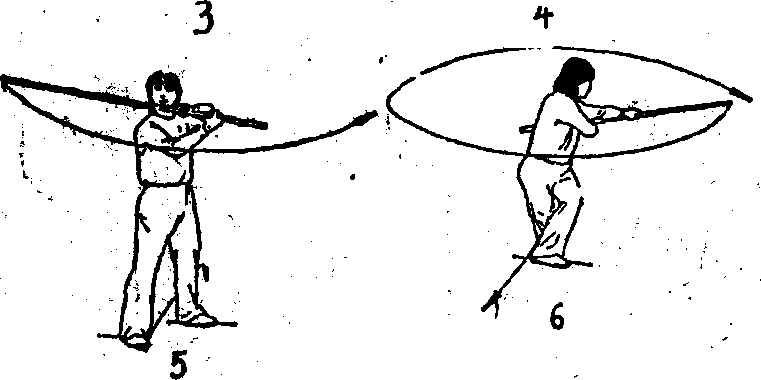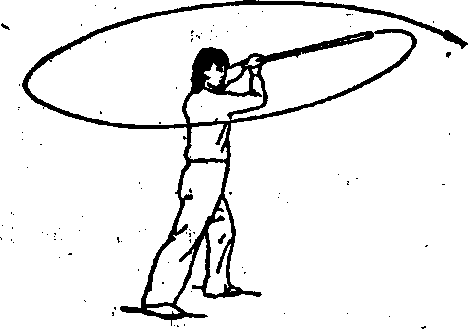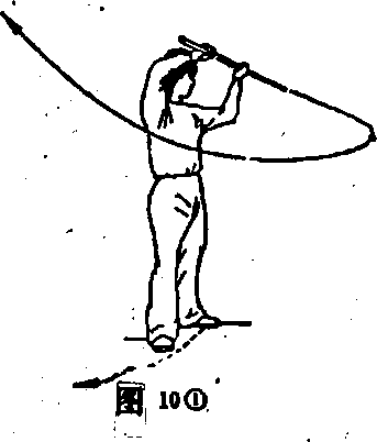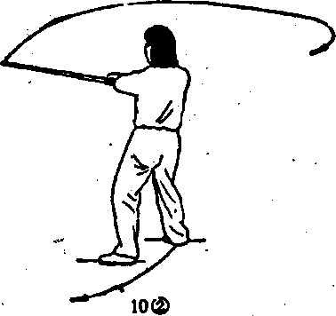 (4) 身体右转,重心右移;同时,双手持棍随转体向右平抡- 周。(图10?)