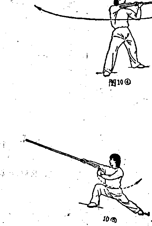 “ D身体稍右转,右脚以右上步洞时,双手持棍向右平抡? 周:(图 10?) “