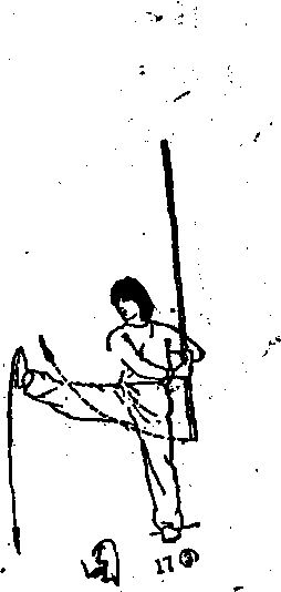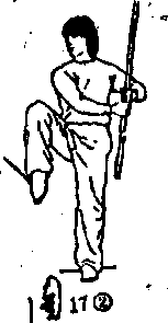 (2)左腿直立,右腿屈膝提起;同时,双手持棍使棍梢向上摆 动;目视右侧。,(图17②)