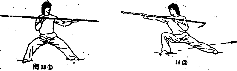 12)重必有移成右弓步,同时,双 手持棍向若侧R出问视棍把。(图18 ②) .”