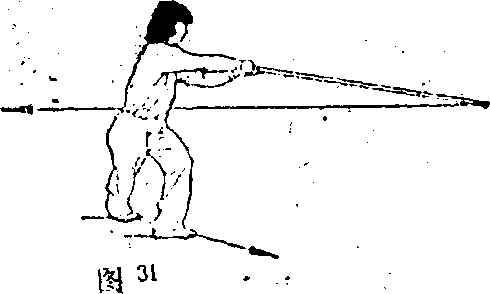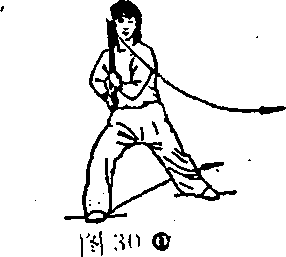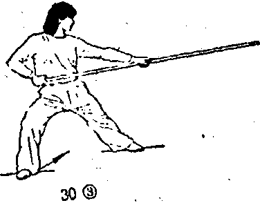 ?30、播步绞棍(1)身体稍右转,左脚向左落步成右弓步,同时,双手持棍向 上,向右前方劈棍,目视棍梢。(图30①)(2)身体稍左转,右鲫向左后方插步;同时,双手持棍向左}必l 目视棍梢。(图30 2)(3)左卿向左前方上步;同时,双手持棍左臂内旋扣腕,右手殒 把稍向前下压,使棍梢沿顺时针方向绞绕一周,目视棍梢。(图303)31、插步戳棍身体捎左转,右脚向左后插步;同时,右手持棍向左前下方戳、 出,左手滑握至右手前。(图31)