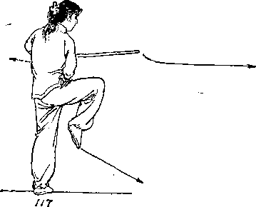 ① 左腿支撑站立,右腿屈膝提起I右手握剑,在右臂内 侧向下立圆绕环,随之屈肘回带于胸前,手心向里,左臂屈 肘回收,左剑指附于右腕处> 目视前方(图117)。