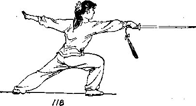 ② 右脚向前落步,屈膝成弓步> 右手握剑下落于腰 间,随之直臂前刺,与肩同高,虎口向上,左剑指直臂向后 伸出,略高于肩,虎口向上I目视剑尖(图118) ?