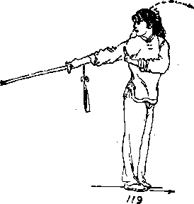 ① 两脚并步站立;右手握剑向后反撩剑,剑尖与腰同 高,左剑指立于右肩前;目视剑尖(图119)。