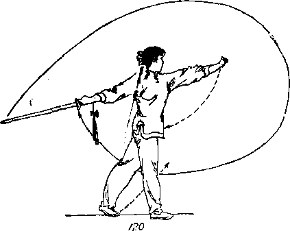 ② 右脚向前进步,左脚跟离地》左剑指向上、向前划 弧,与头同高,虎口斜向上;目视剑指(图120)。