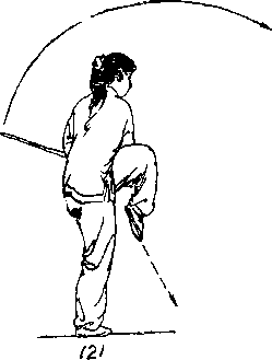 ③ 右腿支撑站立,左腿屈膝向前提起> 上体稍前倾j 右手握剑向上、向前经体左侧向后挂起,剑尖与腰同高,左 剑指下落,附于右腕处> 目视前方(图121)。