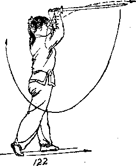 ④ 左脚向前落步,右脚跟离地》右手握剑继续向上、 向前挂起I目视前方(图122)。